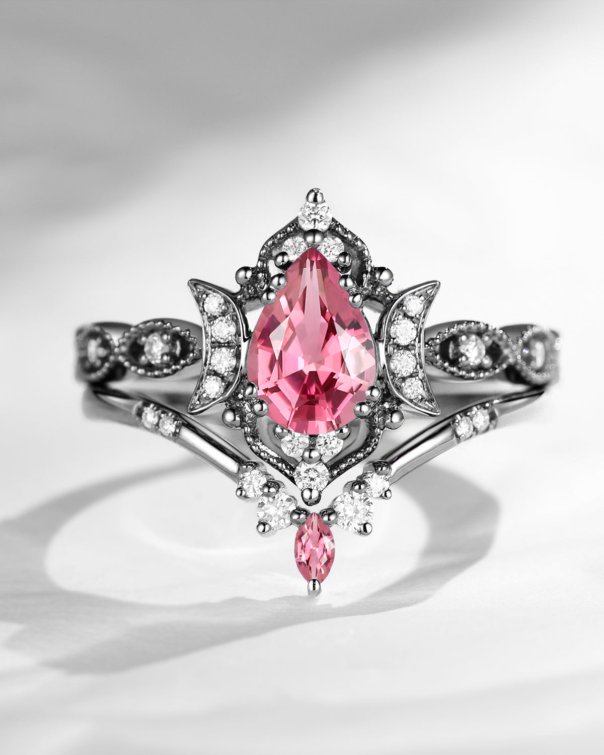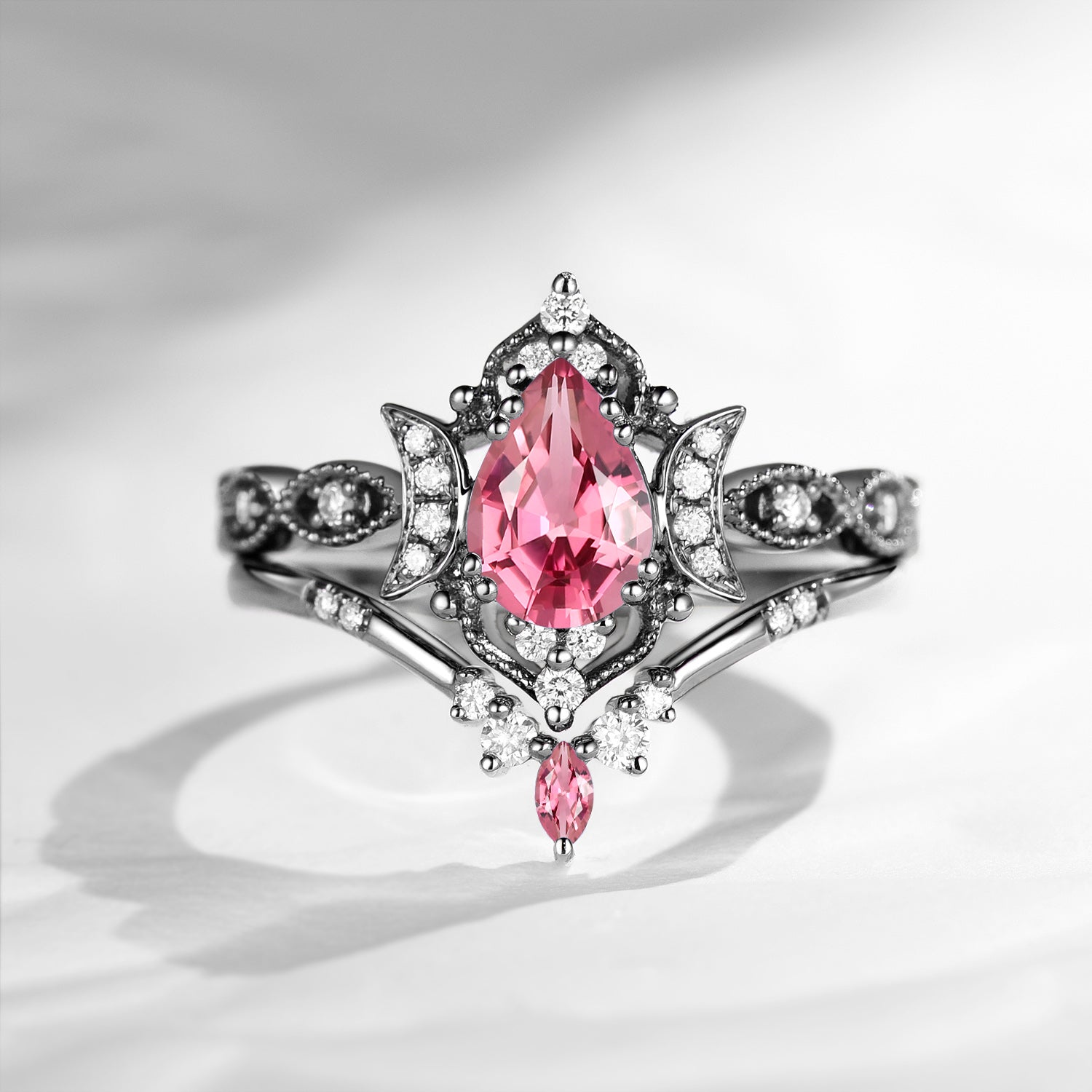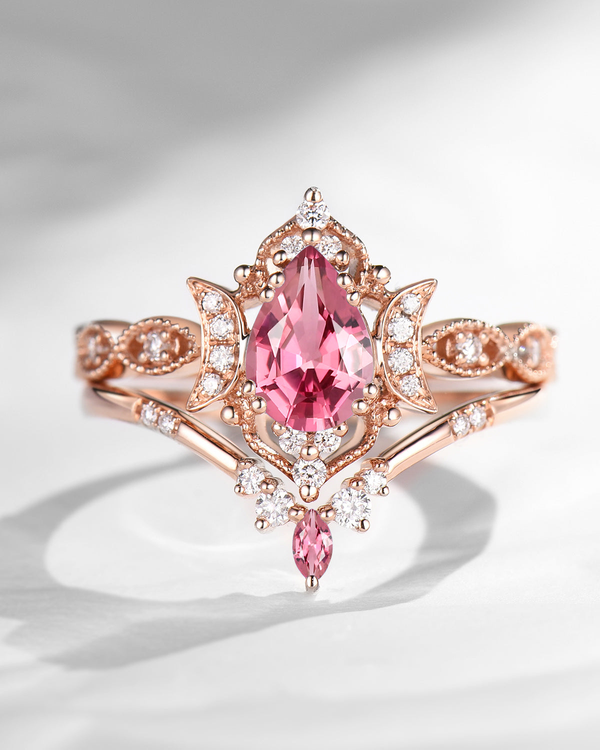 Antique Stacking Set With Pear Shaped Pink Lab Diamond Engagement Ring & Concise Wedding Band ‘Evelyn'
