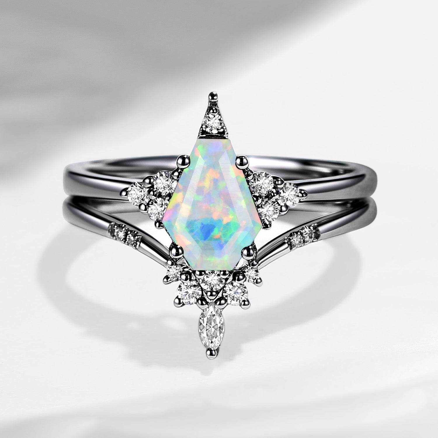Unique Coffin Opal Engagement Ring Star Ring Set 2Pcs Coffin Cut Opal Bridal Cluster Ring