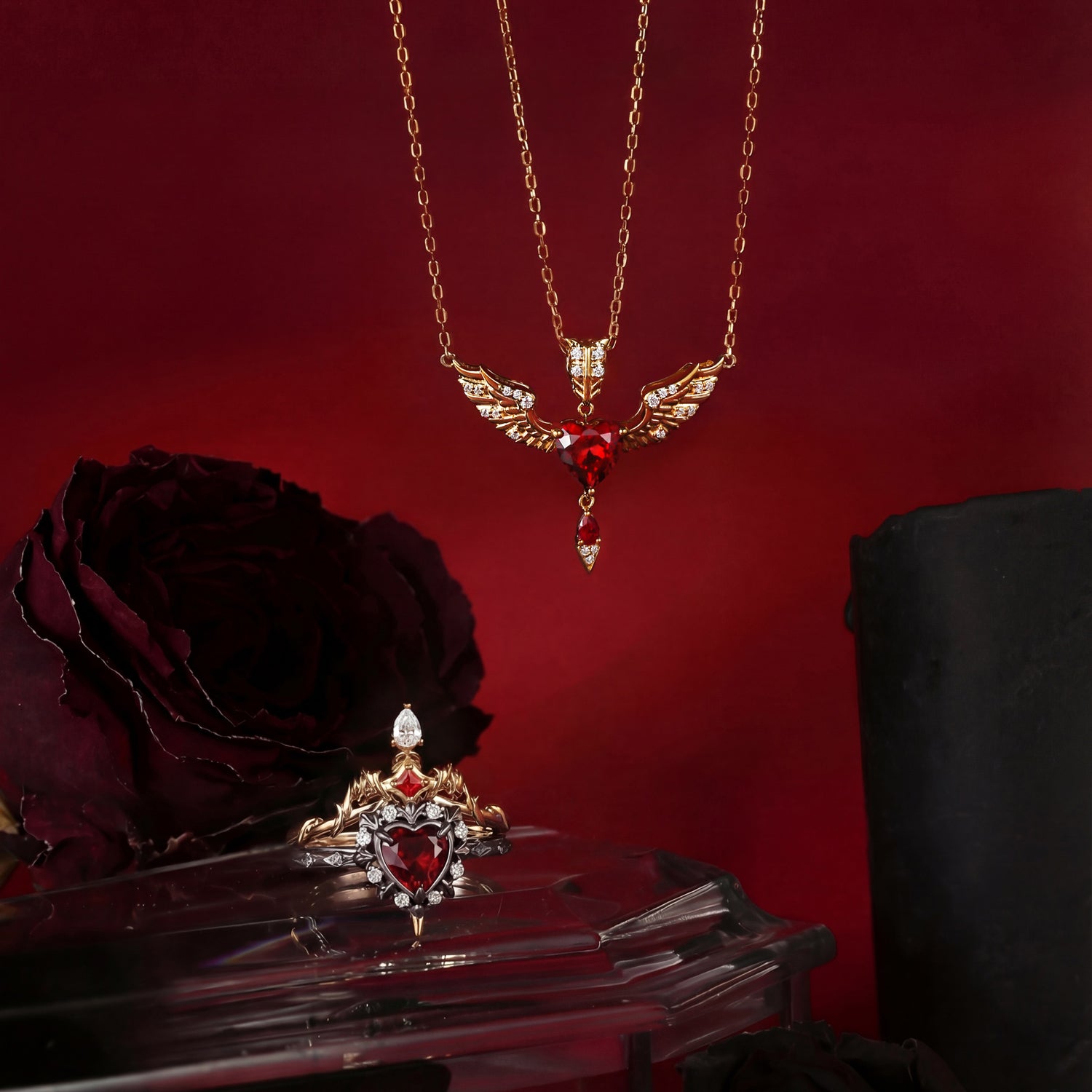 Unique Gothic Heart Garnet Sword Ring Feather Angel Wing Inspired Jewelry - 'Cupid's Arrow' Jewelry Box