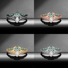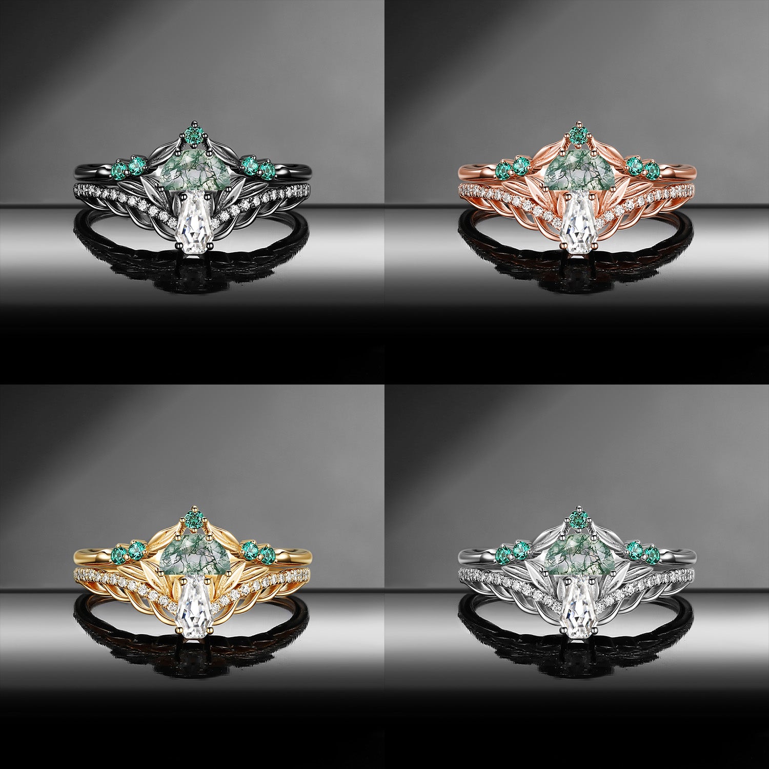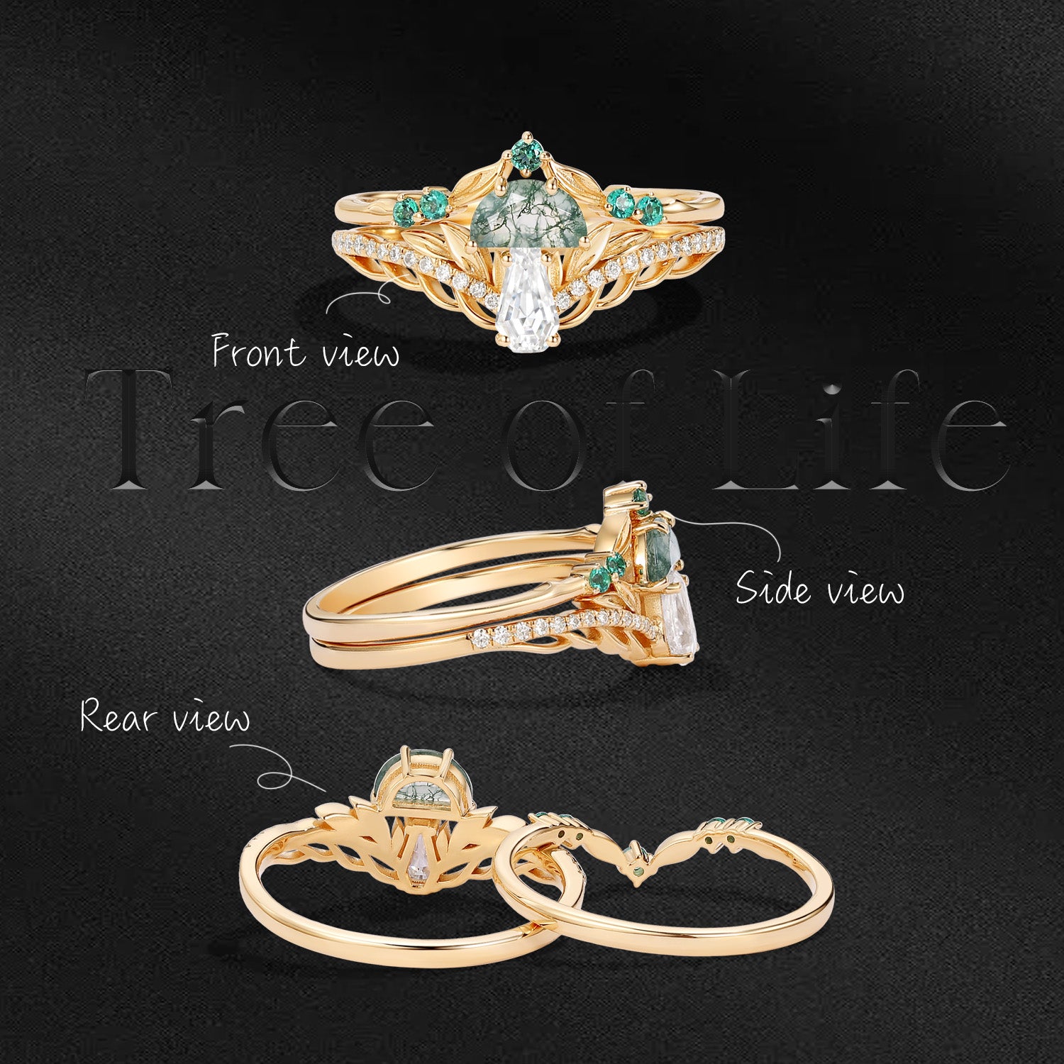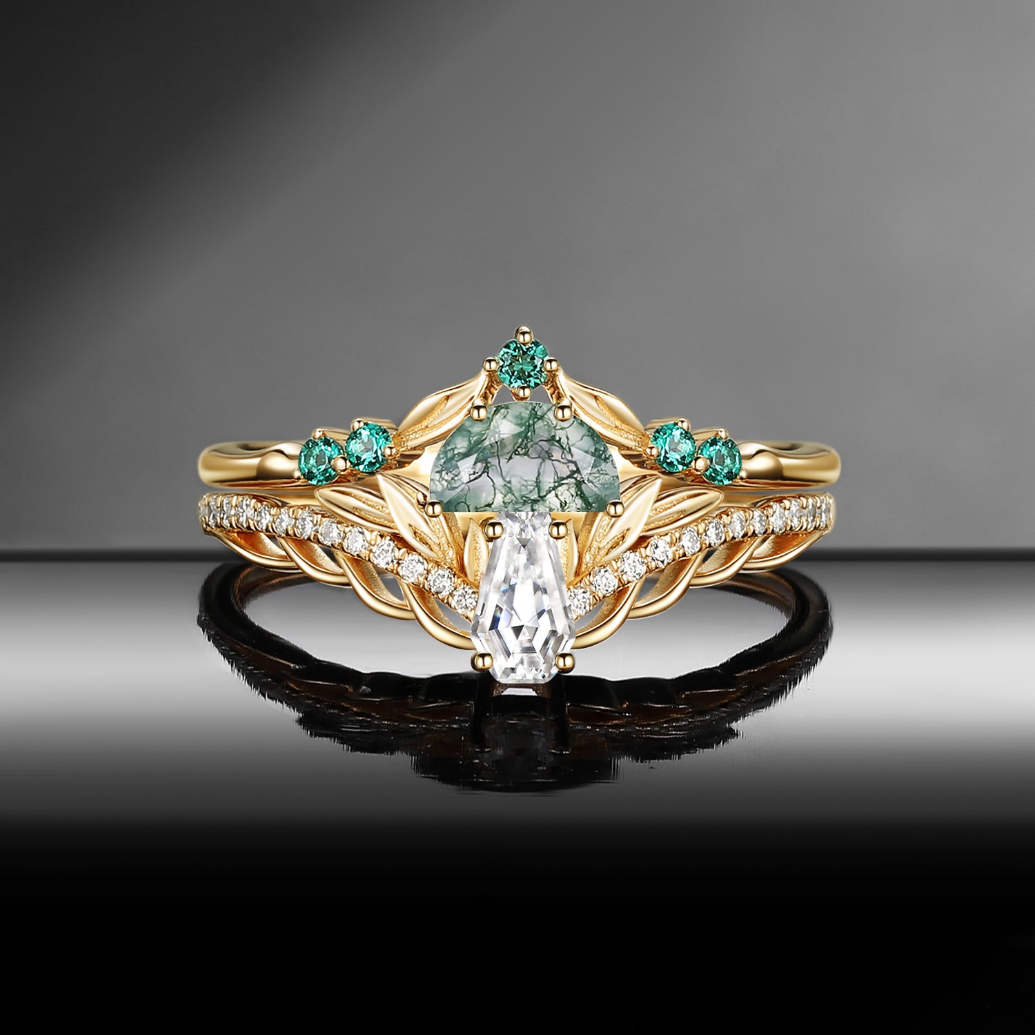 Unique Symbolic 'Tree of Life' Half Moon Moss Agate & Coffin Moissanite Mushroom Engagement Ring Set 2pcs Garden of Eden