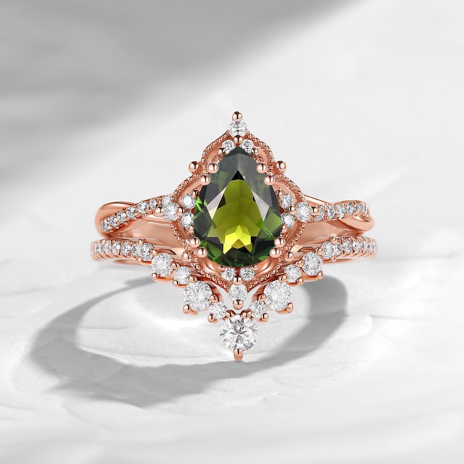 Vintage Inspired Pear Cut Natural Olive Green Tourmaline Infinity Engagement Ring 2pcs