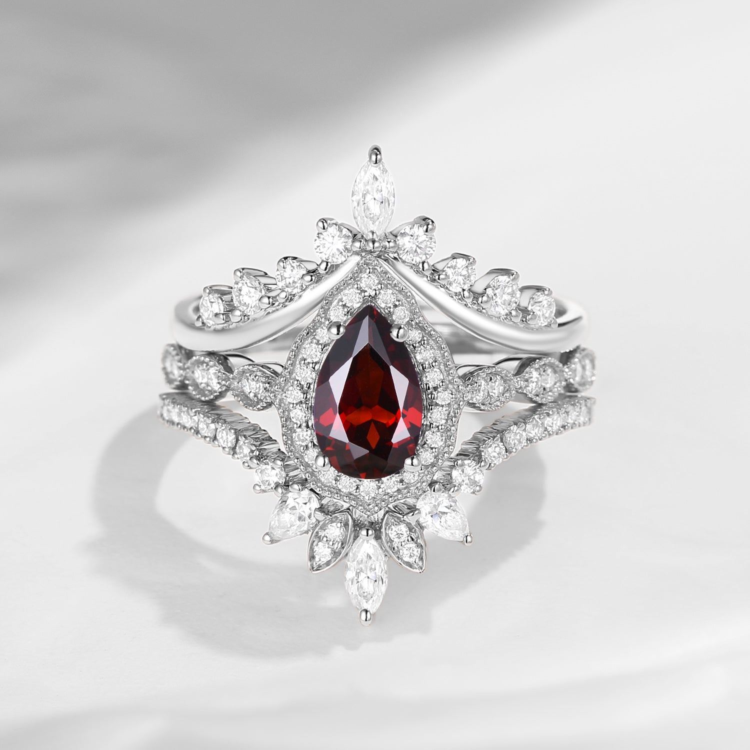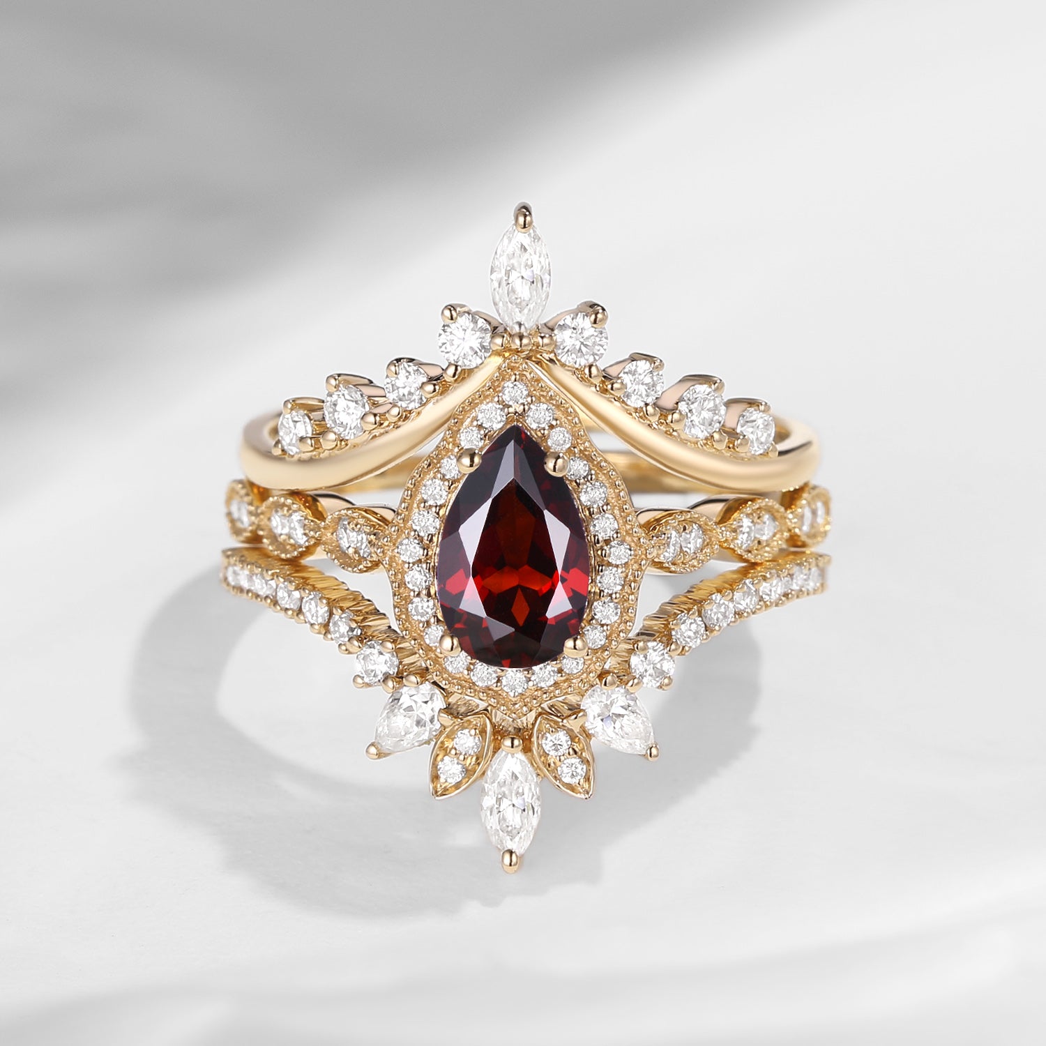 Vintage Inspired Pear Shaped Garnet Engagement Ring Set 3pcs - Diva