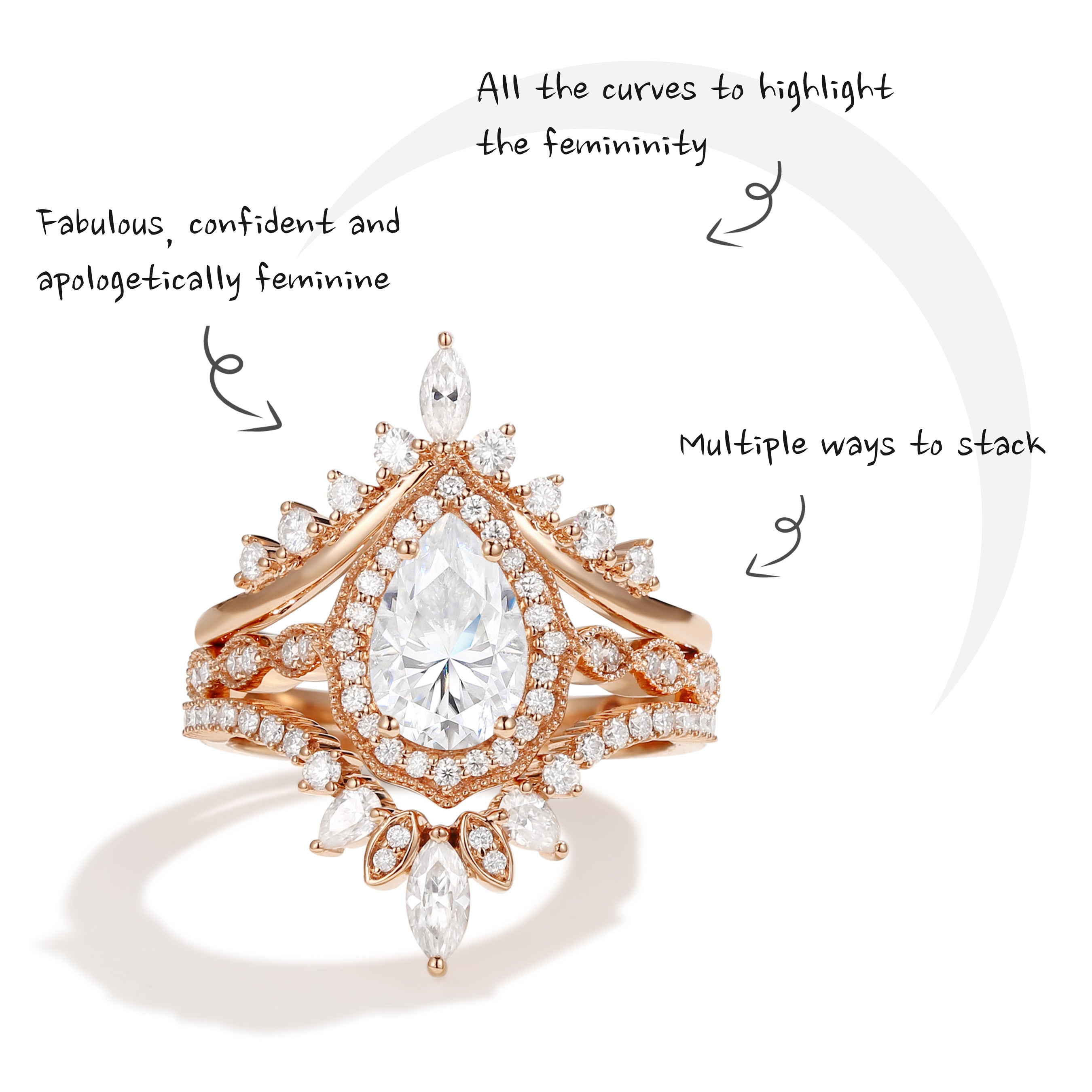 Pear shaped Moissanite Engagement Ring Set Rose Gold Milgrain Cluster Ring Vintage Style Unique Bridal Anniversary