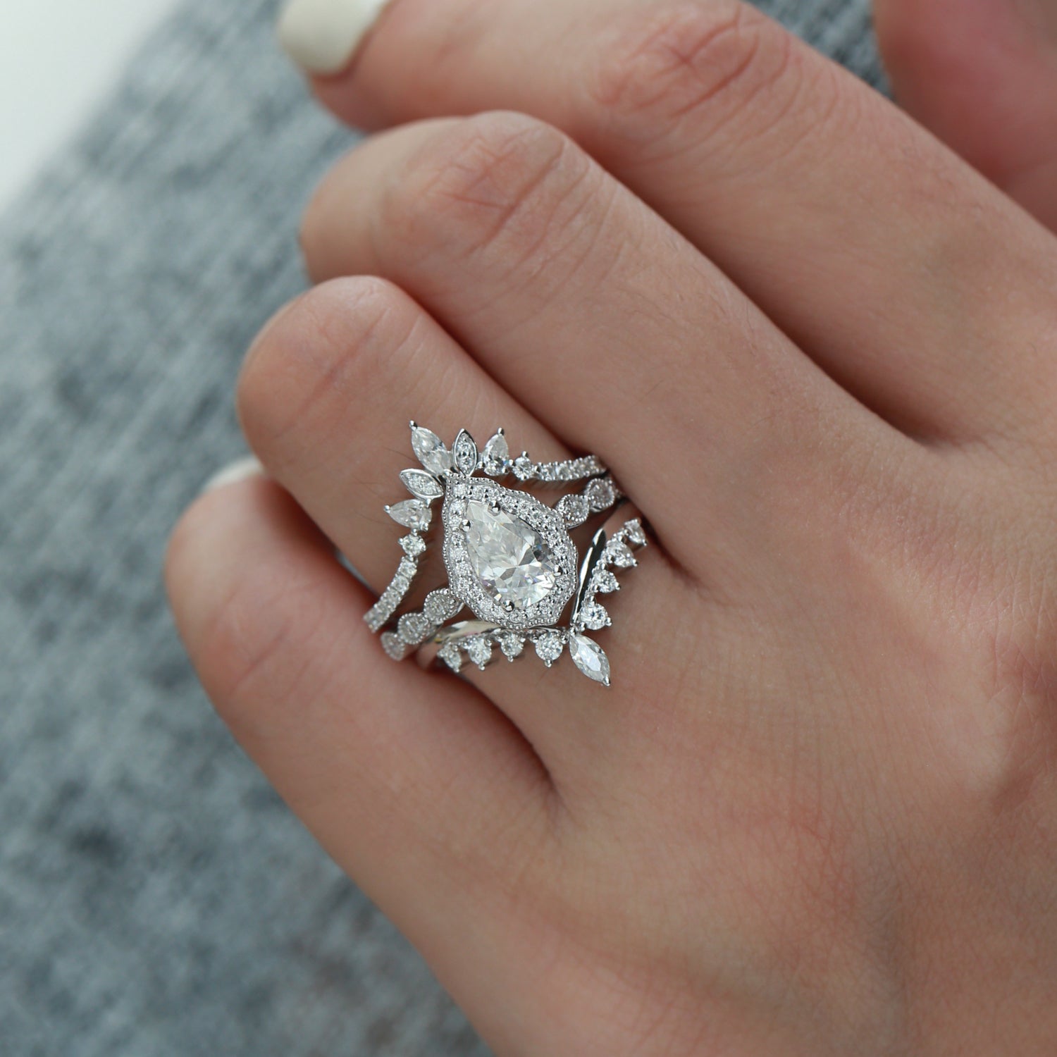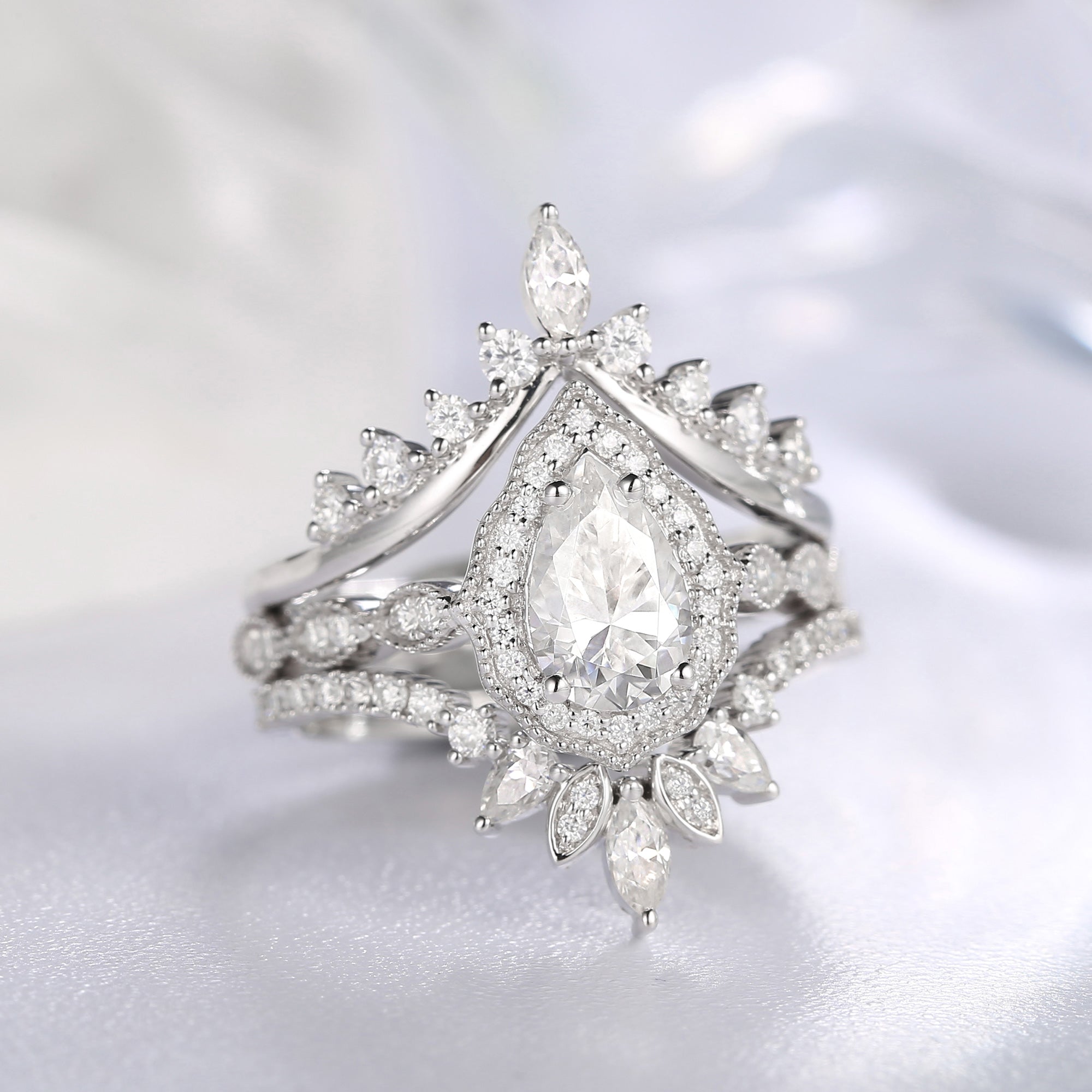 Vintage Inspired Pear Shaped Milgrain Moissanite Engagement Ring Set 3pcs - Diva