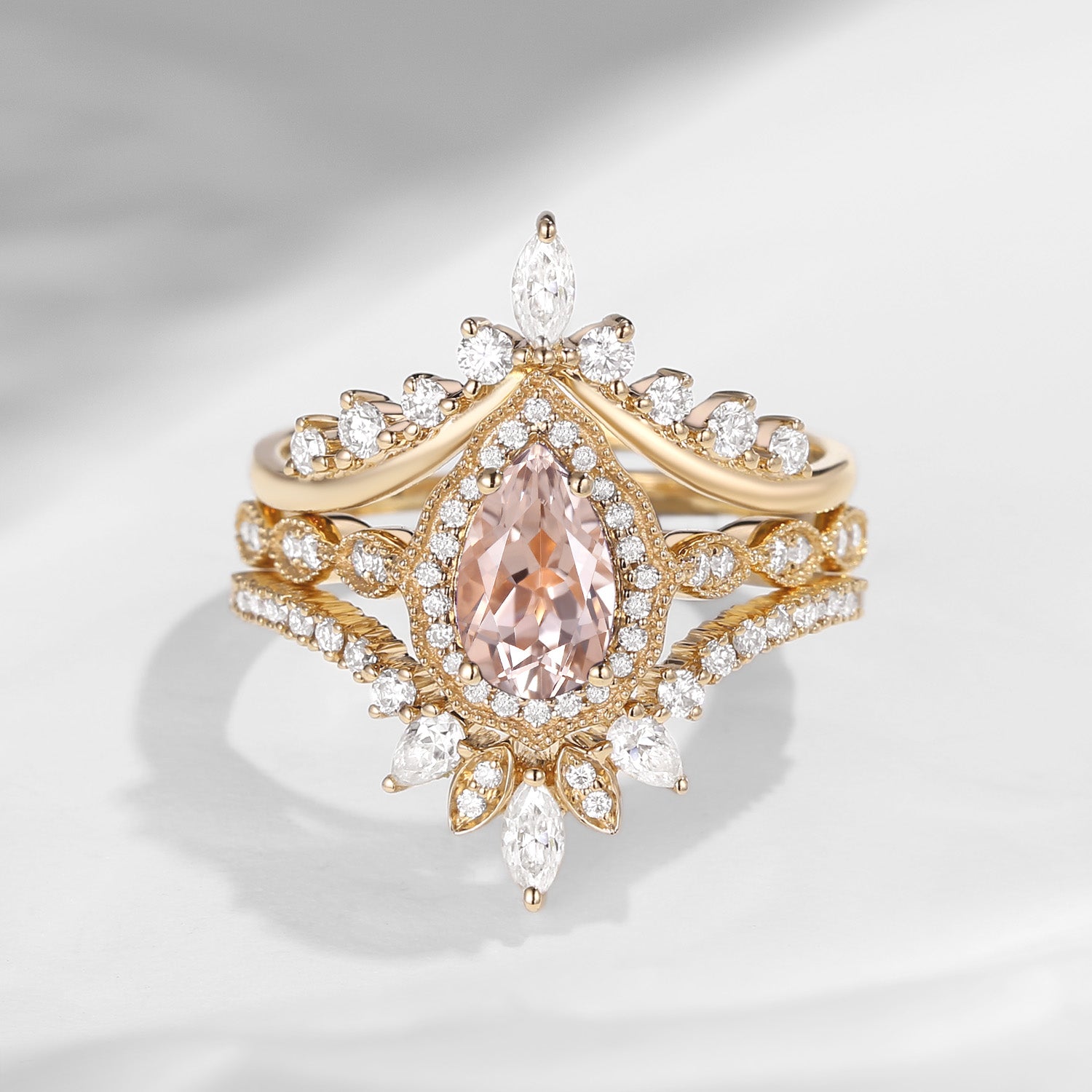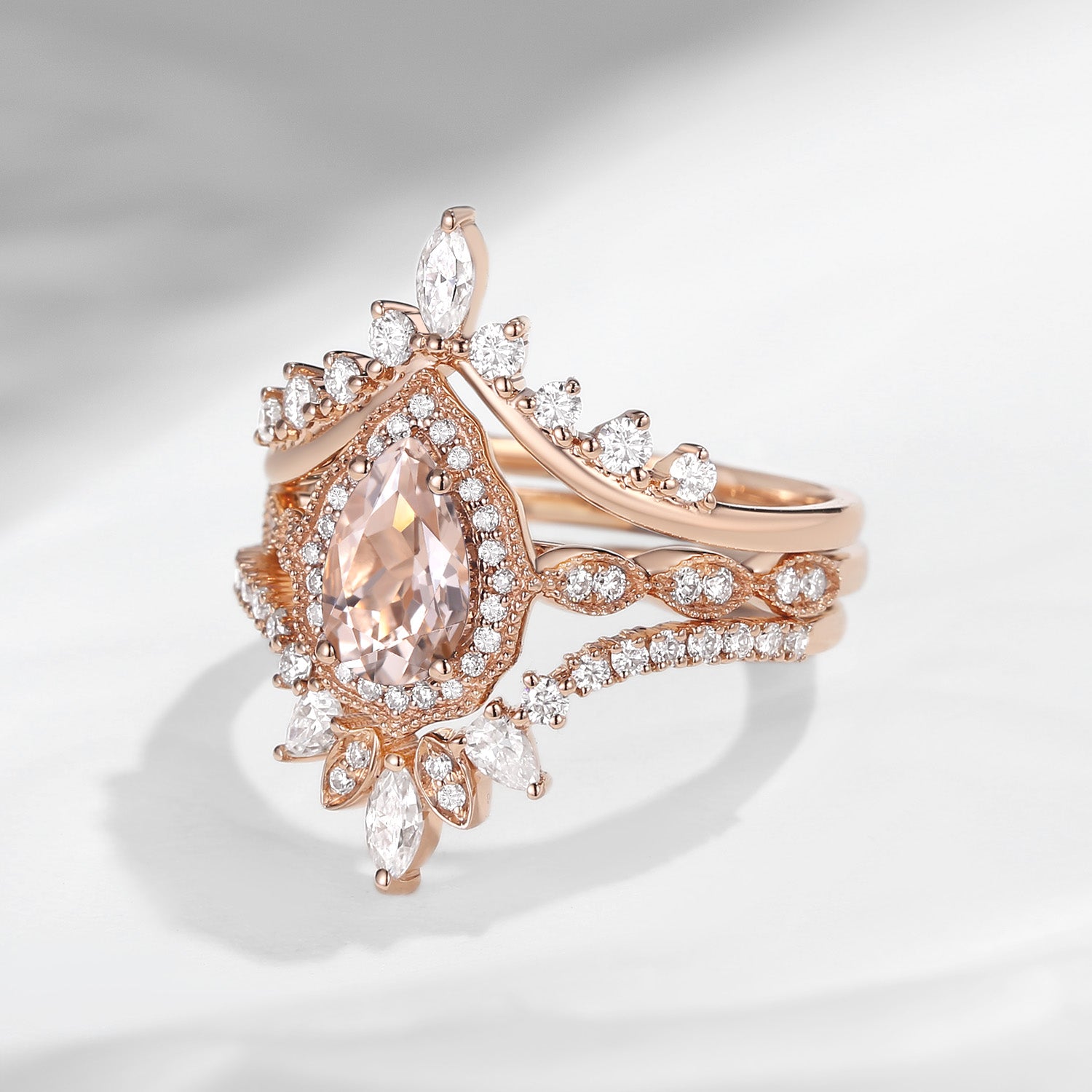 Vintage Inspired Pear Shaped Milgrain Morganite Engagement Ring Set 3pcs Vintage Style Unique Bridal Anniversary