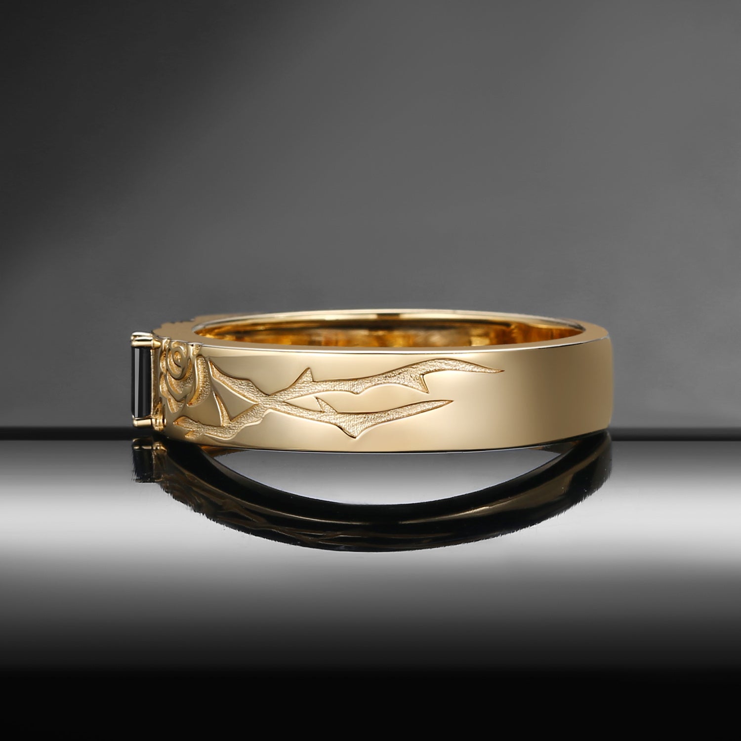Vintage Inspired Rectangular Cut Black Moissanite 'Thorns & Roses' Filigree Wedding Band Unisex - Everlasting Love