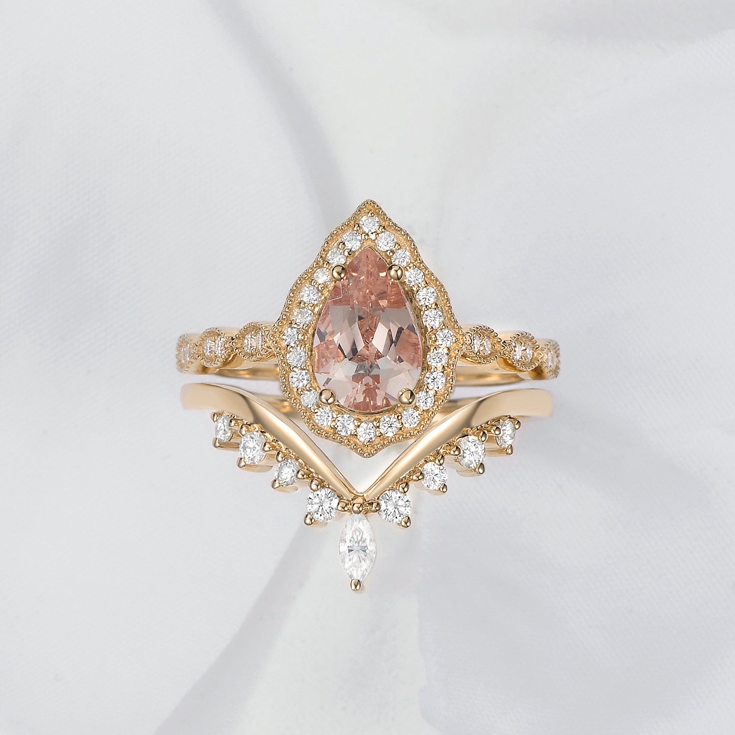 Vintage Morganite Engagement Ring Bridal Set 2pcs